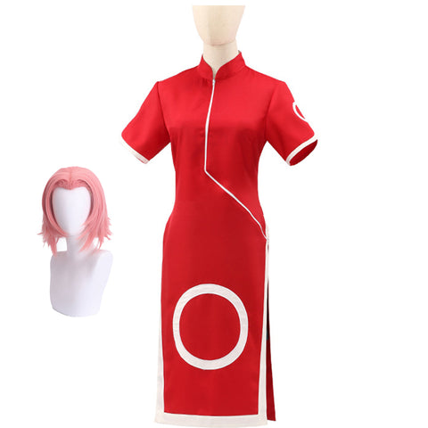 Anime Haruno Sakura Childhood Costume Cheongsam Dress With Wigs and Headband Full Set Cosplay Outfit