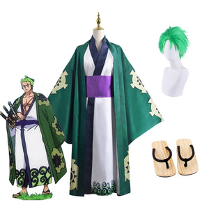 Anime One Piece Wano Country Roronoa Zoro Full Set Kimono Costume With Wigs and Wooden Clogs Set