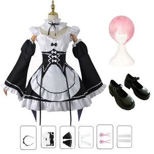 Anime Re:Zero − Starting Life in Another World Ram Full Set Cosplay Dress+Wigs+Shoes Halloween Carnival Cosplay Outfit